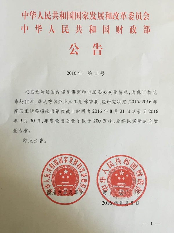 近日,國家發(fā)展改革委和財政部聯(lián)合發(fā)布公告,根據(jù)近階段國內(nèi)棉花供需和市場形勢變化情況,為保證棉花市場供應(yīng),滿足紡織企業(yè)加工用棉需要,經(jīng)研究決定,2015/2016年度國家儲備棉輪出銷售截止時間由2016年8月31日延長至2016年9月30日;年度輪出總量不限于200萬噸,最終以實際成交數(shù)量為準。