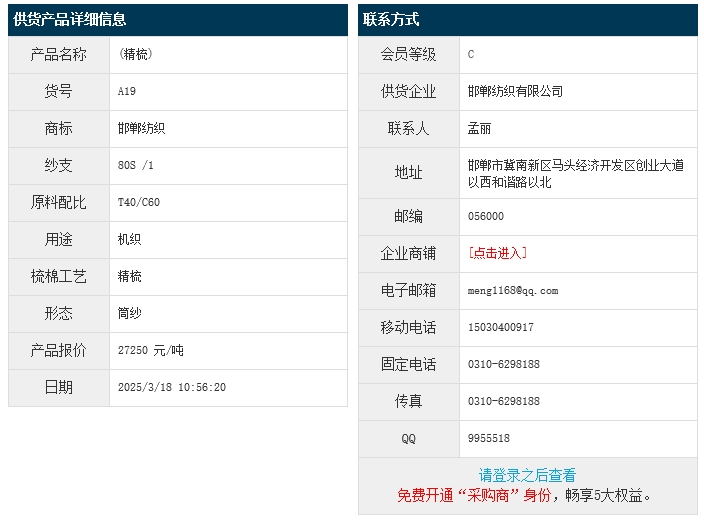 3月18日,邯鄲紡織有限公司機(jī)織滌棉紗JCVC60/40 80S,報(bào)價(jià)為27250元/噸,實(shí)際成交價(jià)以協(xié)商為準(zhǔn)。[點(diǎn)擊查看詳情]