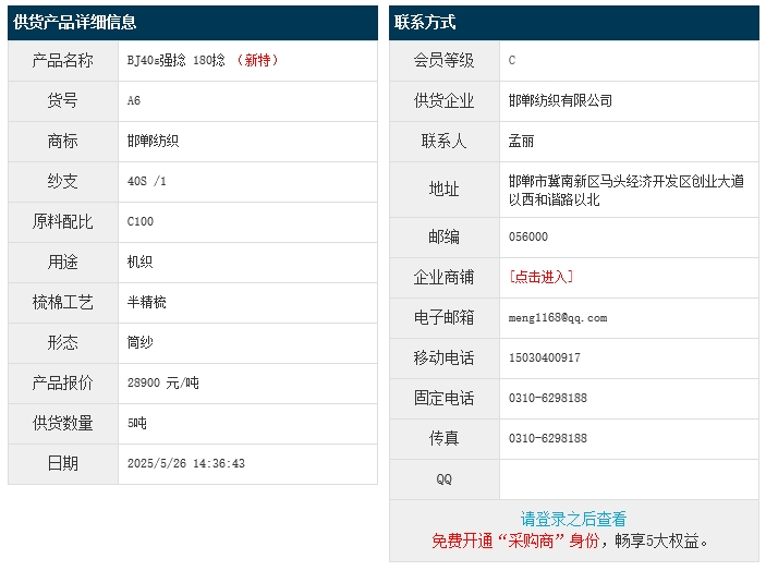 5月26日,邯鄲紡織有限公司機(jī)織純棉紗BJC100 40S 強(qiáng)捻 180捻,報(bào)價(jià)為28900元/噸,實(shí)際成交價(jià)以協(xié)商為準(zhǔn)。[點(diǎn)擊查看詳情]