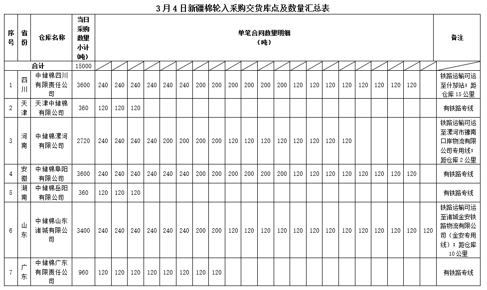 中國儲備棉管理有限公司定于2020年3月4日采購新疆棉15000噸(公定重量),最高限價13565元/噸(折標準級3128B價格)。具體庫點及數量如下:
