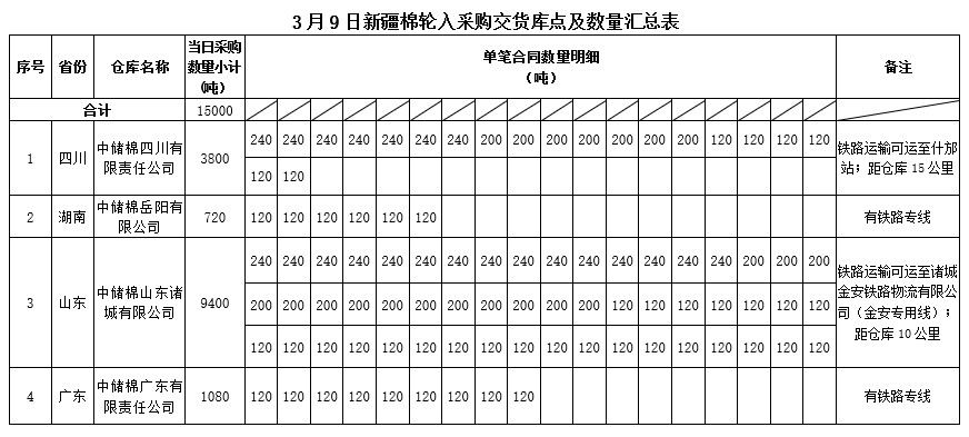 中國儲備棉管理有限公司定于2020年3月9日采購新疆棉15000噸(公定重量),最高限價13144元/噸(折標準級3128B價格)。具體庫點及數(shù)量如下: