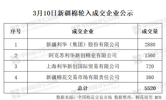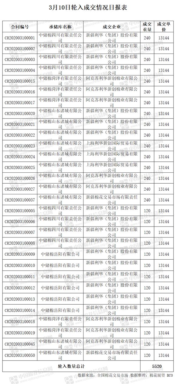 3月10日,中國儲(chǔ)備棉管理有限公司計(jì)劃采購新疆棉15000噸,實(shí)際成交5520噸,成交率36.80%,成交均價(jià)13144元/噸。 其中內(nèi)地庫成交5520噸。