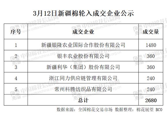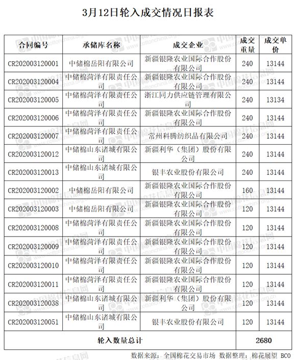 3月12日,中國儲(chǔ)備棉管理有限公司計(jì)劃采購新疆棉15000噸,實(shí)際成交2680噸,成交率17.87%,成交均價(jià)13143元/噸。 其中內(nèi)地庫成交2680噸。