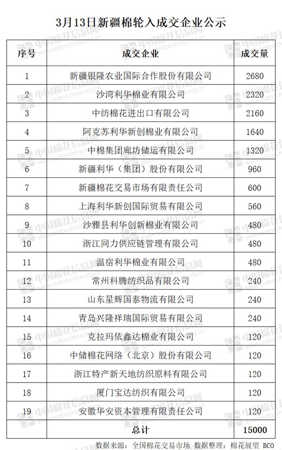 3月13日,中國儲備棉管理有限公司計劃采購新疆棉15000噸,實際成交15000噸,成交率100%,成交均價13017元/噸。 其中內(nèi)地庫成交15000噸。