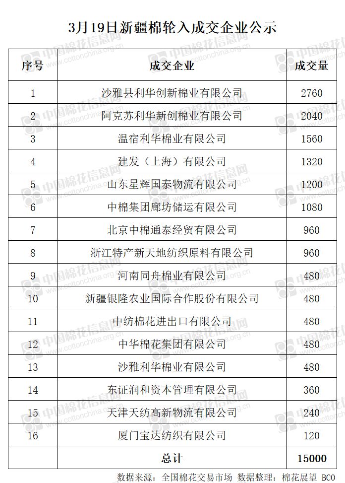3月19日,中國儲備棉管理有限公司計劃采購新疆棉15000噸,實際成交15000噸,成交率100%,成交均價12353元/噸。 其中內(nèi)地庫成交15000噸。