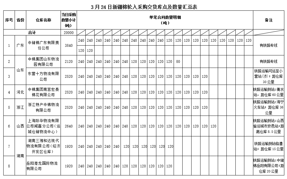 中國儲備棉管理有限公司定于2020年3月24日采購新疆棉20000噸(公定重量),最高限價12450元/噸(折標準級3128B價格)。具體庫點及數(shù)量如下: