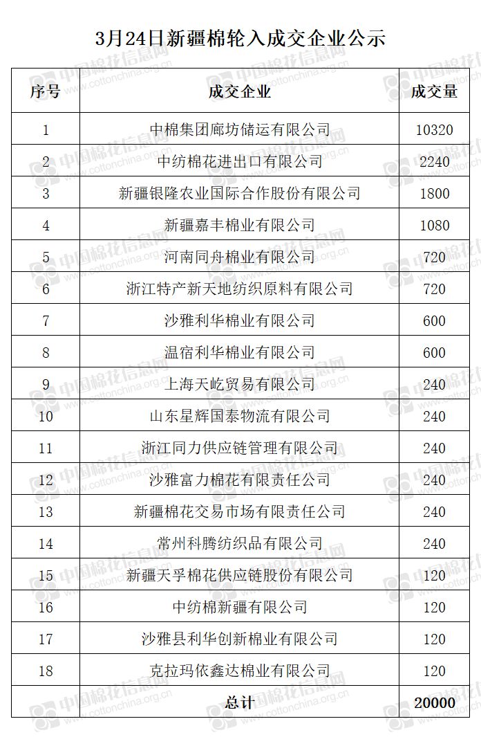 3月24日,中國儲(chǔ)備棉管理有限公司計(jì)劃采購新疆棉20000噸,實(shí)際成交20000噸,成交率100%,成交均價(jià)12313元/噸。 其中內(nèi)地庫成交20000噸。