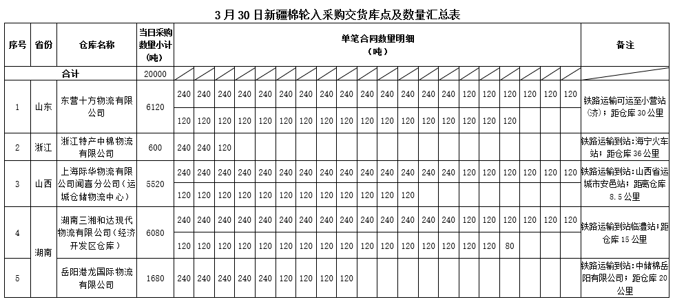 中國儲備棉管理有限公司定于2020年3月30日采購新疆棉20000噸(公定重量),最高限價11550元/噸(折標(biāo)準(zhǔn)級3128B價格)。具體庫點及數(shù)量如下: