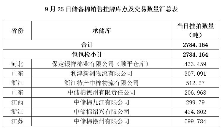 中國儲備棉管理有限公司定于9月25日上市銷售儲備棉重量2784.164噸,共16捆,其中新疆棉1461.27噸。