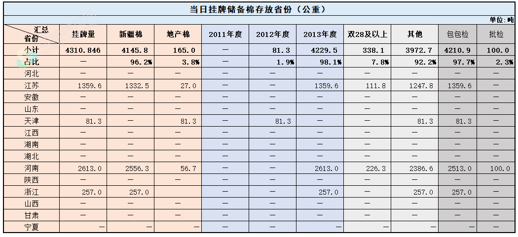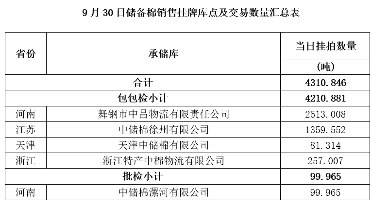 中國儲備棉管理有限公司定于9月30日上市銷售儲備棉重量4310.846噸,共31捆,其中新疆棉4145.83噸。