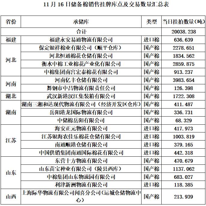 中國儲備棉管理有限公司定于11月16日通過全國棉花交易市場上市銷售中央儲備棉重量20038.238噸,共84捆。具體庫點及數(shù)量見下表。