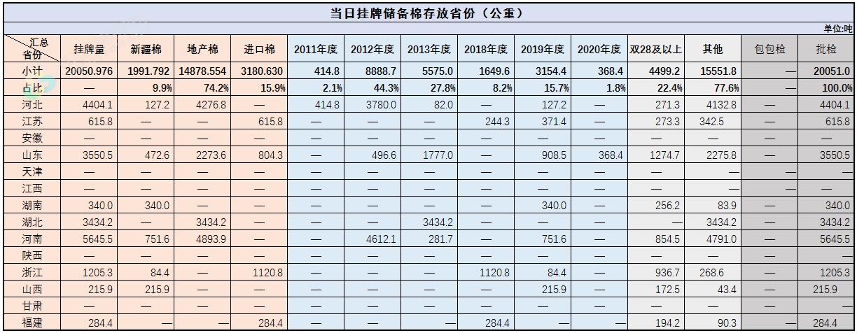 中國(guó)儲(chǔ)備棉管理有限公司定于11月19日通過全國(guó)棉花交易市場(chǎng)上市銷售中央儲(chǔ)備棉重量20050.976噸,共95捆。具體庫(kù)點(diǎn)及數(shù)量見下表。