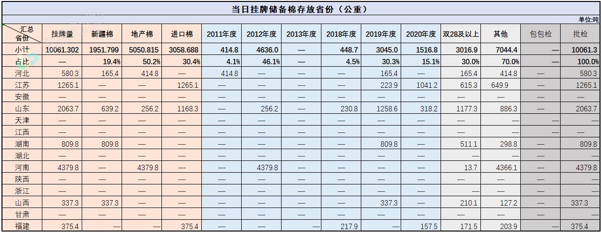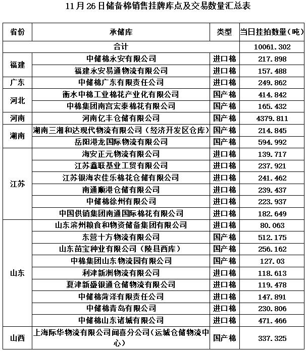 中國儲備棉管理有限公司定于11月26日通過全國棉花交易市場上市銷售中央儲備棉重量10061.302噸,共50捆。具體庫點及數(shù)量見下表。