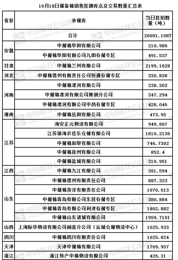 文章原地址:關(guān)于發(fā)布10月18日儲(chǔ)備棉銷售掛牌庫(kù)點(diǎn)及數(shù)量的公告