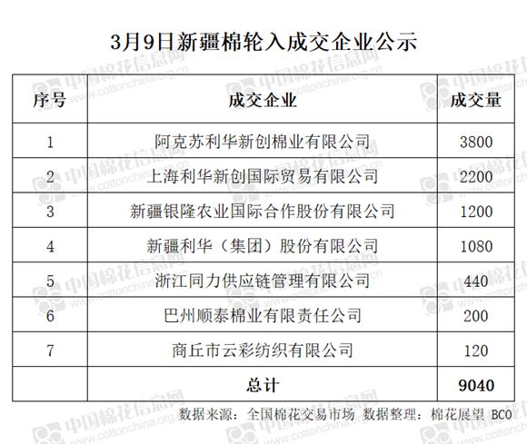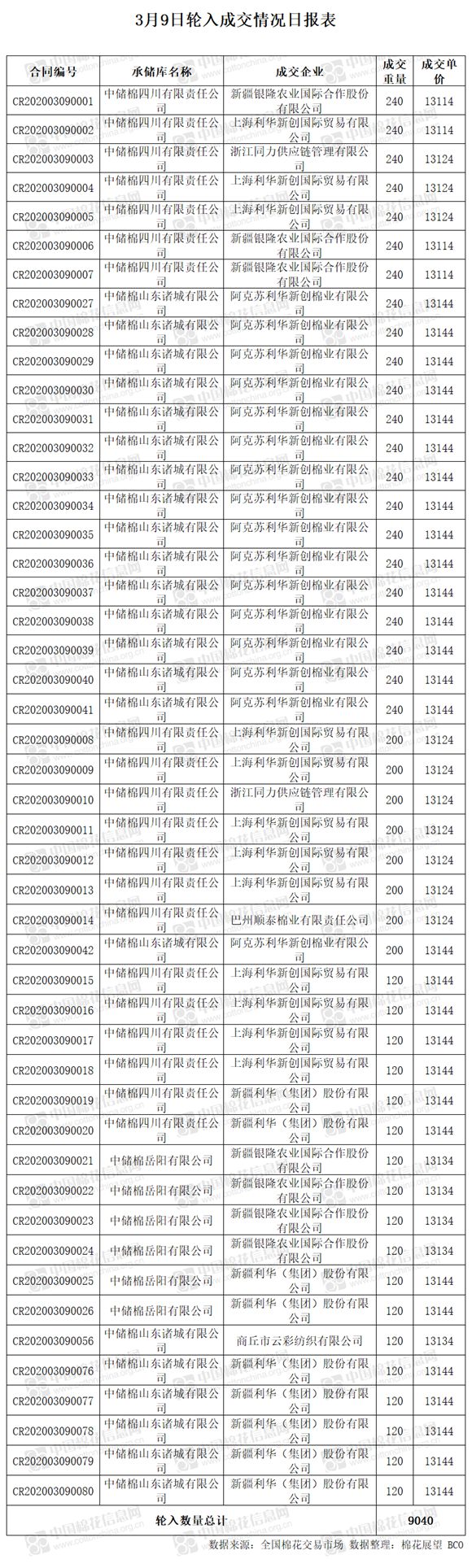 3月9日,中國(guó)儲(chǔ)備棉管理有限公司計(jì)劃采購(gòu)新疆棉15000噸,實(shí)際成交9040噸,成交率60.27%,成交均價(jià)13135元/噸。 其中內(nèi)地庫(kù)成交9040噸。