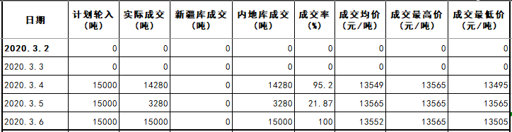 截至3月6日,累計(jì)掛牌采購(gòu)51.5萬噸,累計(jì)成交均價(jià)13636元/噸,成交最高價(jià)14197元/噸,成交最低價(jià)12879元/噸。
