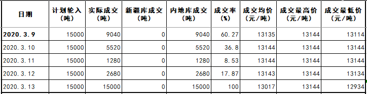 截至3月13日,累計掛牌采購59.0萬噸,累計成交均價13555元/噸,成交最高價14197元/噸,成交最低價12879元/噸。
