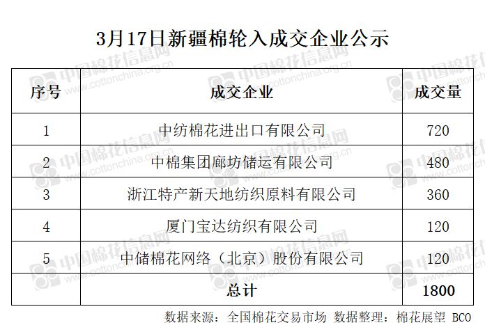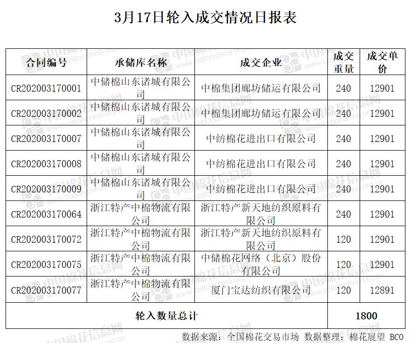3月17日,中國(guó)儲(chǔ)備棉管理有限公司計(jì)劃采購(gòu)新疆棉15000噸,實(shí)際成交1800噸,成交率12%,成交均價(jià)12900元/噸。 其中內(nèi)地庫(kù)成交1800噸。
