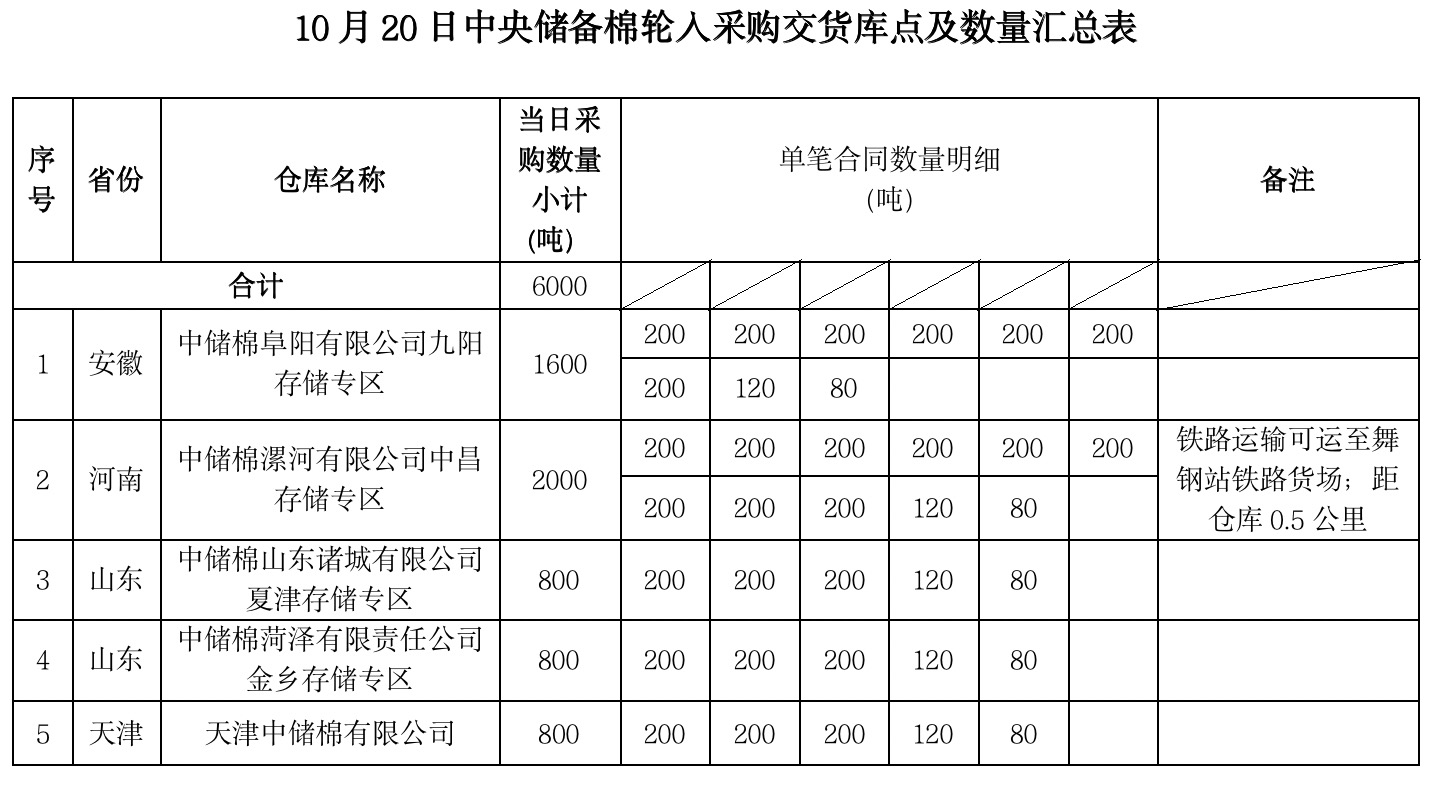 中國(guó)儲(chǔ)備棉管理有限公司定于2022年10月20日采購(gòu)棉花6000噸(公定重量)。具體庫(kù)點(diǎn)及數(shù)量如下:
