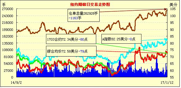 周四USDA發(fā)布的1月供需預(yù)測報告利空,期價下跌;1703合約收于72.34美分/磅,跌80點;1705合約收于72.85美分/磅,跌81點。當(dāng)日主力合約在上半場交易微幅上漲,USDA報告發(fā)布后開市走低,收盤前有所回升,最終跌幅超1%。本月報告上調(diào)美棉產(chǎn)量至將近1700萬包,并上調(diào)期末庫存;最新公布的美棉銷售狀況保持良好,較前一周明顯增加。