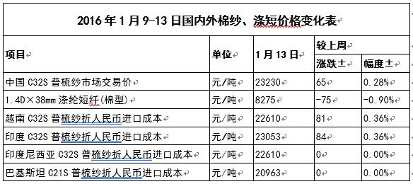 1月13日,越南32支普梳純棉紗22610元/噸(折人民幣進口成本,下同),較中國國內32支普梳純棉紗低620元/噸,價差較上周縮小16元/噸;印度32支普梳純棉紗23053元/噸,較中國國內32支普梳純棉紗低177元/噸,價差較上周縮小19元/噸;印度尼西亞32支普梳純棉紗22610元/噸,較中國國內32支普梳純棉紗低620元/噸,價差較上周擴大65元/噸。