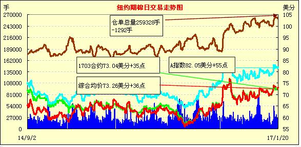 20日,受美棉出口報告利好促進市場穩(wěn)定,近期3月合約結算價73.04美分/磅,漲35點;1705月合約73.67美分,漲41點;1712月合約71.19美分,漲6點。市場整日交易以穩(wěn)定為主,近期3月合約圍繞73美分展開交易,上下波動幅度僅57點,目前價位為近三個月以來的高位震蕩水平。據美國農業(yè)部(USDA),1.6-1.12一周美國凈簽約出口2016/17年度陸地棉78585噸,較前一周增47%,較近四周平均增33%,截至12日美棉已簽約量完成預期出口總量的77%,高于去年同期的64%。
