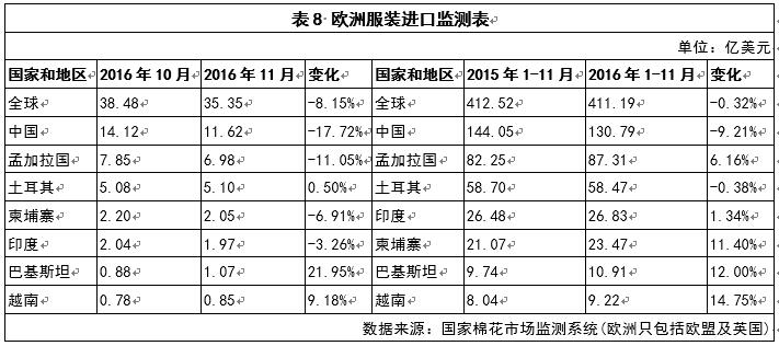 2016年11月,歐洲服裝進(jìn)口金額35.35億美元,較10月份減少8.15%;2016年1-11月,歐洲累計(jì)服裝進(jìn)口額口411.19億美元,同比減少0.32%,主要進(jìn)口來(lái)源為中國(guó)、孟加拉國(guó)、土耳其、印度、柬埔寨、巴基斯坦和越南(見表8)。