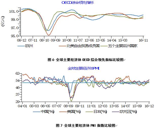 2016年11月,歐洲OECD綜合領(lǐng)先指數(shù)100.19,環(huán)比上漲0.08,同比下跌0.07;北美自由貿(mào)易區(qū)成員國(guó)OECD綜合領(lǐng)先指數(shù)99.47,環(huán)比上漲0.06,同比上漲0.02;5個(gè)主要亞洲國(guó)家OECD綜合領(lǐng)先指數(shù)99.82,環(huán)比上漲0.14,同比上漲0.46(見圖6)。