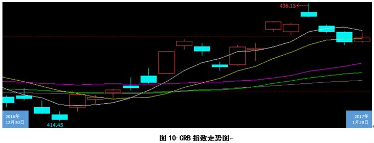 2017年1月20日,CRB指數(shù)收盤價(jià)429.79,環(huán)比上漲11.92,漲幅2.85%(見圖10)。