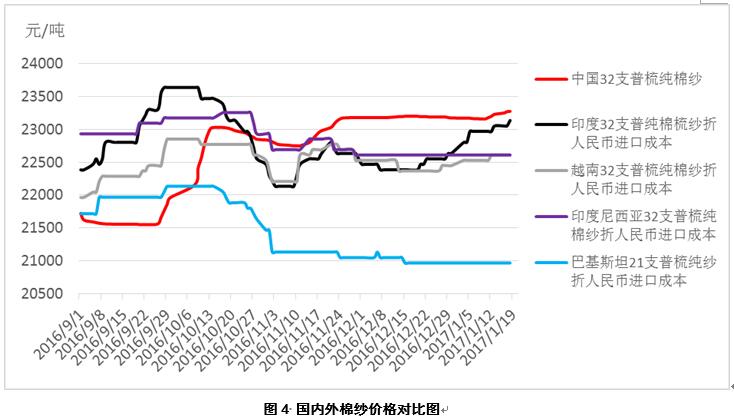一個(gè)月以來(lái),國(guó)外棉紗價(jià)格漲幅明顯大于國(guó)內(nèi)棉紗,印度棉紗價(jià)格漲幅最大,價(jià)格水平已接近國(guó)內(nèi)棉紗(見表2、圖4)。