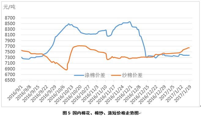 一個(gè)月以來(lái),國(guó)內(nèi)棉花與滌短之間價(jià)差變化不大,與棉紗之間價(jià)差大幅增加(見表3、圖5)。