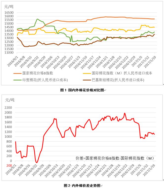 一個(gè)月以來(lái),國(guó)內(nèi)棉花價(jià)格持續(xù)下跌,國(guó)外棉花價(jià)格普遍上漲,其中印、巴棉價(jià)漲幅較大,明顯高于外棉平均價(jià)格水平。內(nèi)外棉價(jià)差由1975元/噸縮小至982元/噸(見表1、圖1、圖2、圖3)。