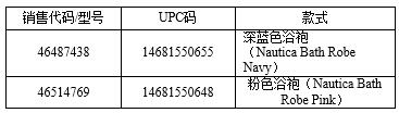 此次召回的產(chǎn)品為Nautica100%棉制嬰兒帶帽浴袍,適合0~9個歲的嬰兒,顏色有粉色或深藍色。該產(chǎn)品的相關信息如下,