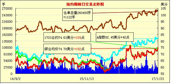 本周第一個(gè)交易日,紐約期棉因美元下跌暴漲;1703合約收于74.63美分/磅,漲159點(diǎn);1705合約收于75.17美分/磅,漲150點(diǎn)。當(dāng)日全天主力合約穩(wěn)健上漲,最高價(jià)接近75美分/磅,收盤前合約價(jià)保持在當(dāng)日交投區(qū)間頂部,最終創(chuàng)2016年8月8日以來最高收盤價(jià)。本周一主力合約完成4連漲,總計(jì)上漲252點(diǎn)。據(jù)印度當(dāng)?shù)叵?,印度新花上市仍因貨幣問題受阻,新花供應(yīng)量減少,印度國(guó)內(nèi)供應(yīng)有限給棉價(jià)帶來支撐,目前1705/1703和1712月未點(diǎn)價(jià)合約量還在繼續(xù)增加。