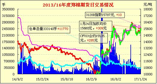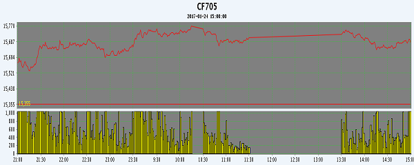 1月24日,隔夜鄭棉CF1705合約調(diào)整后回升,今日早盤(pán)高位震蕩,午后在多頭買(mǎi)盤(pán)推動(dòng)下沖高,午后在平倉(cāng)盤(pán)壓制下調(diào)整,日線形成陽(yáng)線。日內(nèi)成交量放大,持倉(cāng)量增加。基本面情況:臨近春節(jié),棉花市場(chǎng)現(xiàn)貨購(gòu)銷(xiāo)基本停滯,交易冷清,河北等地疆棉手摘雙29級(jí)提貨價(jià)在15900-16000元/噸毛重,地產(chǎn)3128級(jí)價(jià)格在15400-15500元/噸,呈現(xiàn)有價(jià)無(wú)市,廠家基本進(jìn)入休假狀態(tài),且運(yùn)輸車(chē)輛也難找,鮮有短途承運(yùn)。