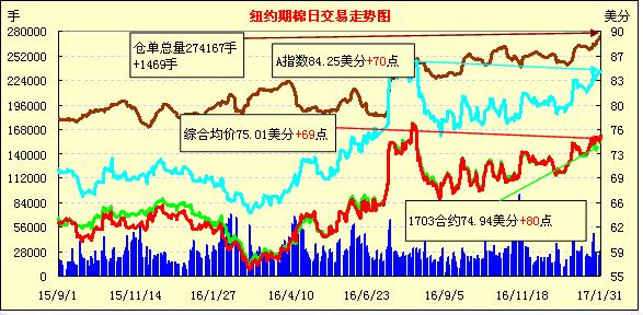 1月最后一個交易日,美元指數(shù)大跌,紐約期棉回補前一日跌幅;1703合約收于74.94美分/磅,漲80點;1705合約收于75.60美分/磅,漲78點。當(dāng)日主力合約在大部分交易時間上漲,開盤時上漲幅度較小,盤中買盤增加,合約最高上漲到75美分以上,收盤前合約在當(dāng)日震蕩區(qū)間中上部浮動。周二3月合約繼續(xù)向5月轉(zhuǎn)移,合約漲幅超過1%。此外因美元下跌,商品價格得到支撐,CRB指數(shù)上漲0.4%。