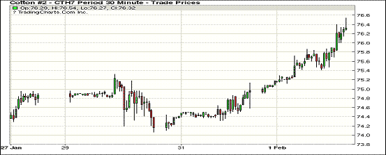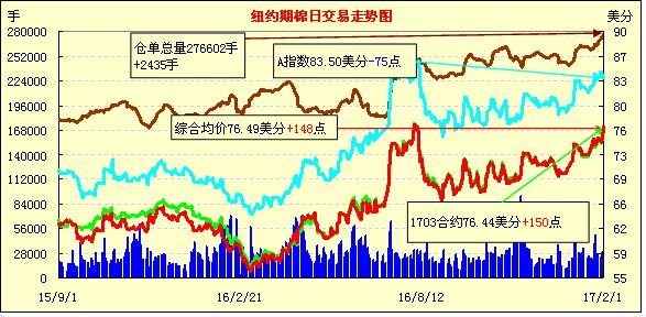 2月1日,紐約期棉繼續(xù)上漲,主力合約收盤價創(chuàng)近半年新高;1703合約收于76.44美分/磅,漲150點;1705合約收于77.05美分/磅,漲145點。當日主力合約僅在開盤后30分鐘內下跌,其余時間上漲,最終合約突破并保持在76美分/磅以上,為去年8月8日以來最高。在過去的兩個交易日,1703合約累計上漲230點。在連續(xù)兩天會議后,美聯儲宣布暫不加息,美股上漲;據市場傳言1月最后一周美棉銷售冷清。