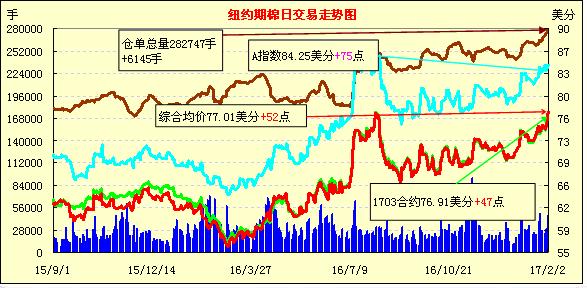 上周美棉出口銷售保持在30萬(wàn)包以上,給期價(jià)繼續(xù)上漲帶來(lái)支撐;1703合約收于76.91美分/磅,漲47點(diǎn);1705合約收于77.57美分/磅,漲52點(diǎn)。當(dāng)日主力合約延續(xù)前一交易日漲勢(shì),開(kāi)盤后上漲強(qiáng)勢(shì),最高價(jià)突破77美分/磅,收盤前價(jià)格回落,但依然保持在漲幅區(qū)間,合約最終小幅收漲。上周美棉簽約銷售量達(dá)到32.87萬(wàn)包,裝運(yùn)35.45萬(wàn)包;目前裝運(yùn)總量已達(dá)到預(yù)計(jì)出口量的41%,去年同期為34%。