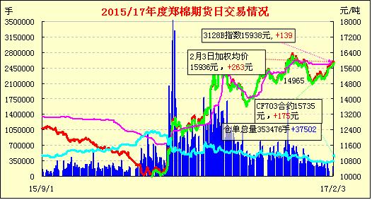 2月3日,春節(jié)期僮紐約棉花期貨上漲,今日鄭棉CF1705合約高開(kāi),早盤(pán)寬幅震蕩并伴隨大量換后,午手增倉(cāng)回穩(wěn),日線(xiàn)形成1/2下影線(xiàn)的陽(yáng)線(xiàn)。日內(nèi)成交量放大,持倉(cāng)量增加?;久媲闆r:2017年春節(jié)過(guò)后開(kāi)工第一天,期貨行情繼續(xù)提漲,受其影響河北市場(chǎng)棉花現(xiàn)貨行情均大幅度上調(diào),但由于需求較淡,而價(jià)格方面又存在分歧,市場(chǎng)暫無(wú)成交。當(dāng)前多數(shù)業(yè)內(nèi)人士預(yù)計(jì)在拋儲(chǔ)前期棉花行情將保持穩(wěn)定上升行情,一是籽棉收購(gòu)工作基本全面結(jié)束,棉花現(xiàn)貨庫(kù)存無(wú)大的上升;二是距離國(guó)家拋儲(chǔ)還有近一個(gè)月時(shí)間,空檔期預(yù)計(jì)行情穩(wěn)定;三是即便是國(guó)儲(chǔ)棉上市,高品質(zhì)新棉依舊受到紡織企業(yè)青睞。
