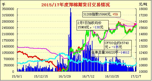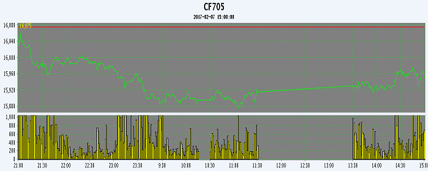 2月7日,隔夜鄭棉CF1705合約下滑,今日盤中低位震蕩,午后在空頭回補推動下回穩(wěn),日線形成陰線。日內(nèi)成交量萎縮,持倉量減少。周一紐約棉花期貨收跌?;久媲闆r:后受內(nèi)外盤期貨行情聯(lián)袂提漲的影響,棉花企業(yè)以及持貨貿(mào)易商對市場行情信心增加,河北的現(xiàn)貨市場行情繼續(xù)提漲,但是紡織企業(yè)對于節(jié)后突漲的市場行情不能接受,采購速度放緩,棉市購銷再現(xiàn)搏弈。