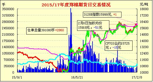 2月8日,隔夜鄭棉CF1705合約盤整,今日早盤受到集中平倉盤打壓下滑,隨后低位震蕩,日線形成陰線星。日內(nèi)成交量與持倉量變化不大?;久媲闆r:盡管各廠還有一些原料庫存,加之今年拋儲及時,棉花貨源應(yīng)該較為充足。但大部分紡企仍感到壓力較大,除了資金壓力,更多的還是棉價上漲帶來的壓力。宜昌某紡企采購負(fù)責(zé)人透露,拋儲前會采購一批棉花,只是新疆棉價格漲幅太大,買完怕拋儲后價格下降,而地產(chǎn)棉價格雖能接受但質(zhì)量較差,著實為難。
