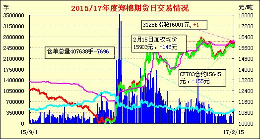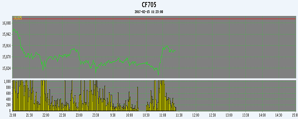 2月15日,隔夜鄭棉CF1705合約高開(kāi)調(diào)整,今日早盤(pán)低位震蕩,午后空頭回補(bǔ)推動(dòng)期價(jià)反彈,尾盤(pán)回落,日線(xiàn)形成長(zhǎng)小陰線(xiàn)。日內(nèi)成交量萎縮,持倉(cāng)量減少?;久媲闆r:棉花市場(chǎng)價(jià)格堅(jiān)挺,新疆部分地區(qū)雙29級(jí)手摘站臺(tái)提貨價(jià)較高至16300元/噸,機(jī)采棉3128級(jí)在15600元/噸偏上水平,山東地區(qū)3128級(jí)地產(chǎn)出廠價(jià)在16200元/噸,但目前高價(jià)略虛,成交跟進(jìn)仍不多,且暫難放量,主要是多等待3月儲(chǔ)備棉輪出后情況而定。