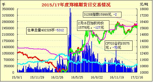2月16日,隔夜鄭棉CF1705合約下試反彈,今日早盤橫向震蕩,午后受到集中平倉(cāng)盤壓制下走低,日線形成長(zhǎng)小陰線。日內(nèi)成交量萎縮,持倉(cāng)量減少?;久媲闆r:據(jù)和布克賽爾蒙古自治縣一家軋花廠反饋,目前“雙28”,“雙29”級(jí)有機(jī)棉價(jià)格在20000-20500元/噸(毛重,站臺(tái)自提),較年前上調(diào)300元/噸左右。目前剩余皮棉多為等級(jí)較低的有機(jī)棉,該軋花廠準(zhǔn)備讓利銷售,價(jià)格約18700-19500元/噸左右。