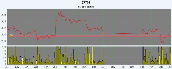 3月2日,隔夜鄭棉CF1705合約盤跌,今日早盤受外棉上漲影響沖高,尾盤在空頭回補(bǔ)支撐下反抽,日線形成陰線星。日內(nèi)成交量萎縮,持倉量減少。基本面情況:北疆機(jī)采棉報(bào)價(jià)在15700-15900元/噸之間,上漲約100-200元/噸。軋花廠表示現(xiàn)貨價(jià)格受期貨影響大,上漲主要受期貨重新反彈至16000附近影響。但是內(nèi)地紡企對新疆棉的詢價(jià)已明顯減少,反而疆內(nèi)企業(yè)成為采購的主力軍。貿(mào)易商也在對拋儲后市作猜想,部分少量囤積高等級棉,認(rèn)為受儲備棉結(jié)構(gòu)限制,高等級棉將在后期走俏。