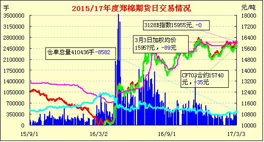 3月3日,隔夜鄭棉CF1705合約上試回落,今日早盤受外棉下跌影響迅速下探創(chuàng)日低,隨后空頭回補(bǔ)推動(dòng)期價(jià)震蕩上行,終盤收復(fù)前日全部跌幅,日線形成長(zhǎng)下影線的陽(yáng)線星。日內(nèi)成交量放大,持倉(cāng)量減少?;久媲闆r:疆內(nèi)4128B2級(jí)機(jī)采棉也較為走俏,成交價(jià)格一般在15450元/噸(毛重自提)左右。湖北大包地產(chǎn)棉也迎來(lái)走貨高峰期,仙桃某廠皮棉級(jí)別多為4129C2級(jí),近來(lái)以15400元/噸的價(jià)格走貨不少,目前廠內(nèi)尚余10車地產(chǎn)棉,吸引部分中小型紡企前來(lái)看貨。