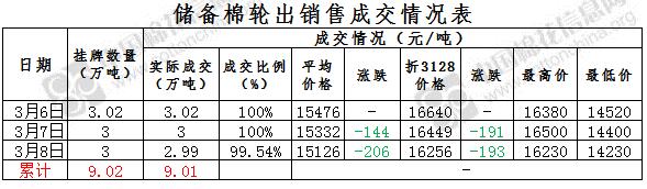 3月8日儲(chǔ)備棉輪出銷售資源30000.024噸,實(shí)際成交29861.398噸,成交率99.54%。當(dāng)日最高成交價(jià)16230元/噸(2012年度新疆棉3捆、地產(chǎn)棉1捆),最低成交價(jià)14230元/噸(2012年度地產(chǎn)棉1捆)。成交平均價(jià)格15126元/噸(較前一日價(jià)格下降206元/噸);折3128價(jià)格:16256元/噸(較前一日價(jià)格下降193元/噸)。當(dāng)日單捆最高加價(jià)2220元/噸(2012年度新疆棉),單捆最低加價(jià)20元/噸(2013年度地產(chǎn)棉2捆)。