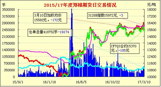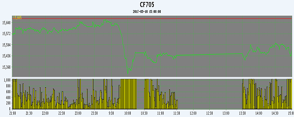 3月10日,隔夜鄭棉CF1705合約反彈,今日早盤在多頭平倉壓制下快速下滑,隨后空頭回補支撐期價脫離低點,日線長下影線的陰線。日內(nèi)成交量放大,持倉量減少?;久媲闆r:3月9日,阿克蘇、巴楚等地監(jiān)管庫3128/2128(斷裂比強度27CN及以上)手采棉毛重報價15600-15800元/噸,“雙28/雙29”手采棉毛重報價雖在16000元/噸左右,但成交并不容易。部分棉企反映,2月下旬以來疆內(nèi)棉紡織廠、貿(mào)易商的詢價、看貨有所增多,采購的重點是“雙28/雙29”等高品質(zhì)高等級棉花,特別是北疆的機采棉更受到青睞,但因軋花廠惜售、報價過高等等原因買賣雙方僵持不下。