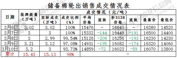 3月10日儲備棉輪出銷售資源32001.452噸,實際成交29995.004噸,成交率93.73%。當(dāng)日最高成交價16070元/噸(2012年度新疆棉),最低成交價13800元/噸(2012年度地產(chǎn)棉)。成交平均價格14859元/噸(較前一日價格下降72元/噸);折3128價格:16023元/噸(較前一日價格下降59元/噸)。當(dāng)日單捆最高加價1840元/噸(2012年度新疆棉),單捆最低加價20元/噸(2011年度地產(chǎn)棉2捆,2012年度地產(chǎn)棉8捆,2013年度地產(chǎn)棉4捆)。
