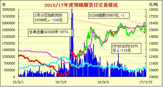 3月15日,隔夜鄭棉CF1705合約回升,今日早盤(pán)橫向震蕩,盤(pán)中高位減倉(cāng),午后在空頭賣(mài)盤(pán)增倉(cāng)打壓下收低,日線形成1/2上影線的陰線。日內(nèi)成交量萎縮,持倉(cāng)量減少?;久媲闆r:白銀棉業(yè)信息中心對(duì)枝江七星臺(tái)鎮(zhèn)、百里洲鎮(zhèn)等地棉農(nóng)進(jìn)行了調(diào)查。今年,當(dāng)?shù)刂裁抟庀蛎黠@上升。主要是去年棉價(jià)回升而其他農(nóng)作物效益走低。