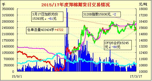 3月17日,隔夜鄭棉CF1705合約盤(pán)整,今日早盤(pán)在空頭賣盤(pán)打壓下回落,隨后在空頭回補(bǔ)的支撐下脫離低點(diǎn)震蕩,日線形成陰線。日內(nèi)成交量放大,持倉(cāng)量增加?;久媲闆r:據(jù)調(diào)查,2017年山東魯西南棉區(qū)棉花種植面積較2016年有小幅回升。菏澤市成武縣大田集申樓村棉農(nóng)講,申樓村是大蒜主產(chǎn)區(qū),蒜棉套種也是主要種植模式之一。全村有4000畝耕地,2016年蒜棉套種大約3000畝左右。由于2016年棉花豐收,棉農(nóng)得到了收益,今年將保持棉花種植面積。